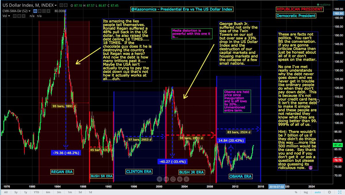 A closer look at the USD under Reagan should many ask what would have been said if Obama suffered a 48% drop in the USD while raising the debt ceiling 18 times….They wouldn’t call him great thats for sure. But lets continue… pic.twitter.com/0gOG6tmP9K
