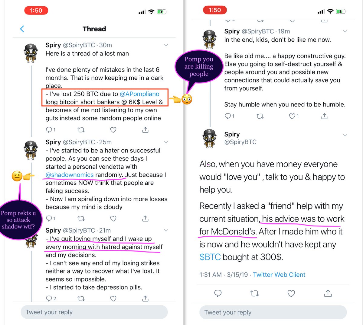 This is 2nd account of @spirybtc the pleb who lost $1.5 million now broke blindly followed @APompliano now totally rekt & salty see screen grabs in this thread 👀.. his 1st attacked with racism & now escalated to death threats please report both accounts this is #footprint 1👱🏻♂️1 pic.twitter.com/9eJYrNH6US